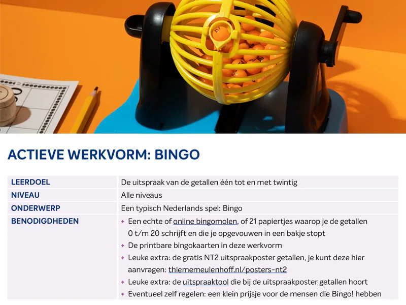Met actieve werkvormen leer je door actief bezig te zijn. Dat maakt leren niet alleen leuker, maar ook effectiever! Met het oer-Hollandse spelletje Bingo oefen je met de hele klas spelenderwijs de uitspraak van de getallen 0 t/m 20. Maar... ís dit spel wel zo Nederlands...? Ook dat ontdek je met deze werkvorm.
