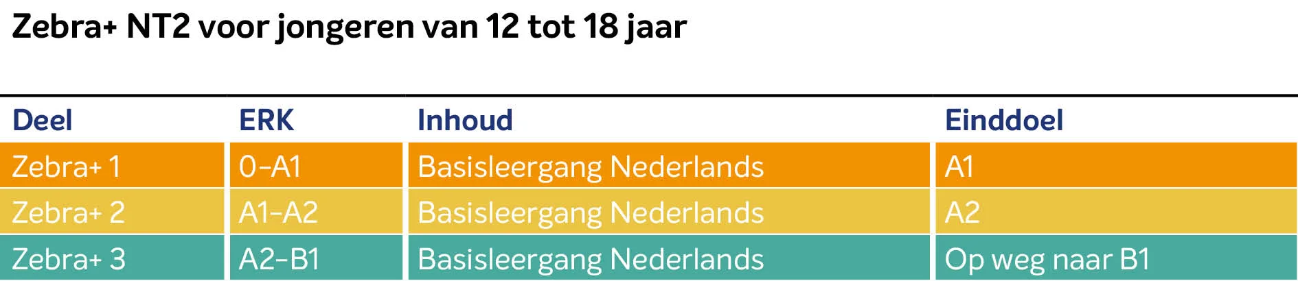 Zebra+ bestaat uit 3 delen, waarbij je vanaf ERK-niveau 0 toewerkt naar A2-B1.