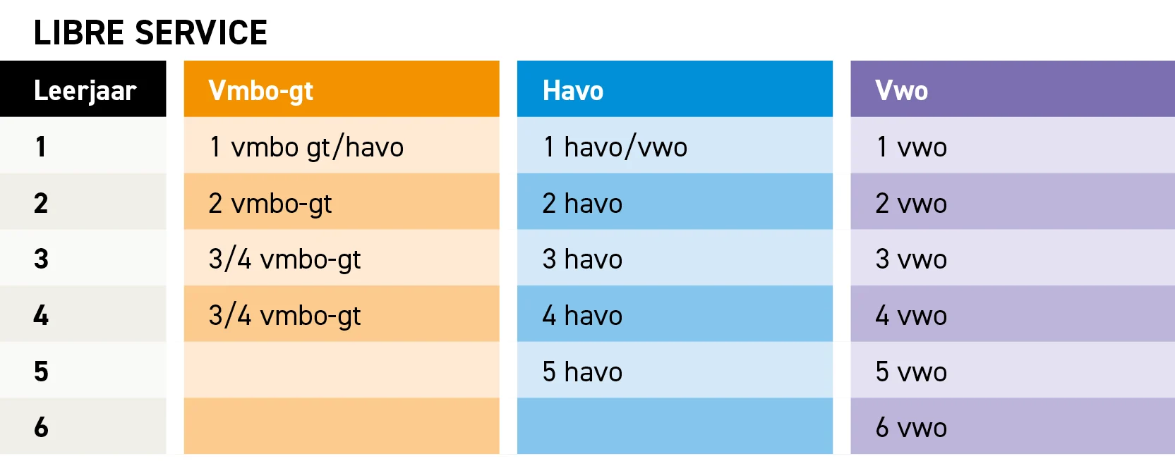 Libre Service biedt een doorlopende leerlijn van onder- tot bovenbouw voor vmbo, havo en vwo. Bekijk hiernaast het volledige aanbod.
