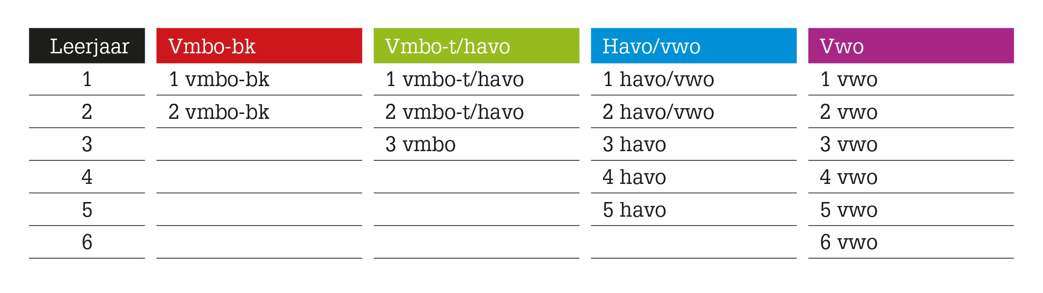 Intro is er voor vmbo, havo en vwo. In onderstaand schema zie je voor welke leerjaren en niveaus deze methode beschikbaar is. De methode is gebaseerd op de nieuwste inzichten en ontwikkelingen in het onderwijs. Wij geloven dat leren leuk moet zijn en dat leerlingen het beste leren als ze zelf actief betrokken worden bij het leerproces.