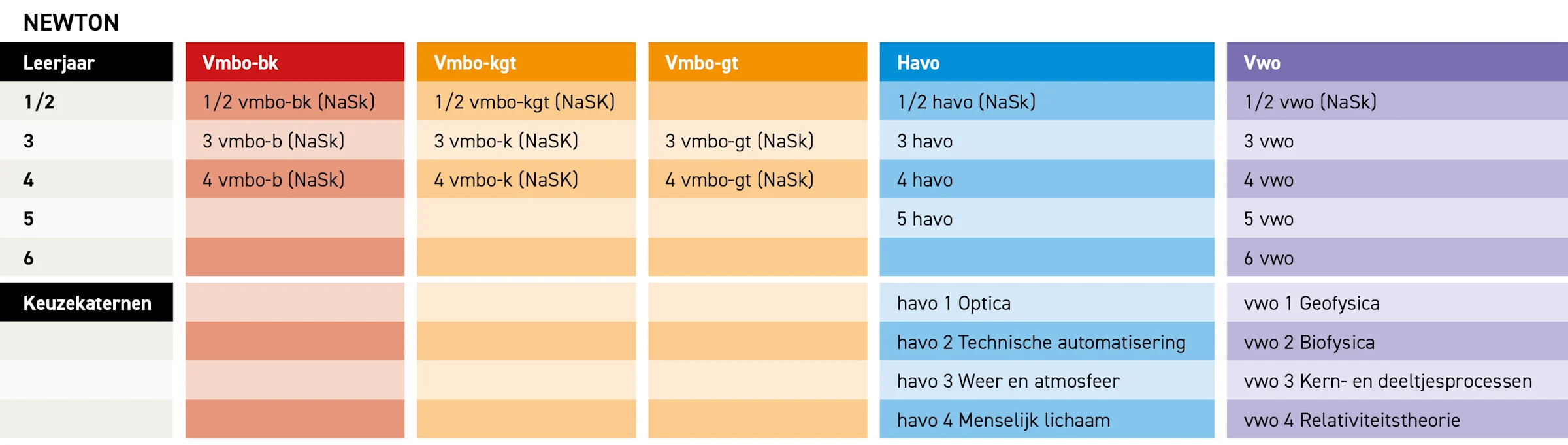 Newton is er voor bovenbouw havo en vwo. Met Newton NaSk voor vmbo en onderbouw havo en vwo creëer je een doorlopende leerlijn. In onderstaand schema zie je voor welke leerjaren en niveaus deze methode beschikbaar is. De methode is gebaseerd op de nieuwste inzichten en ontwikkelingen in het onderwijs. Wij geloven dat leren leuk moet zijn en dat leerlingen het beste leren als ze zelf actief betrokken worden bij het leerproces.