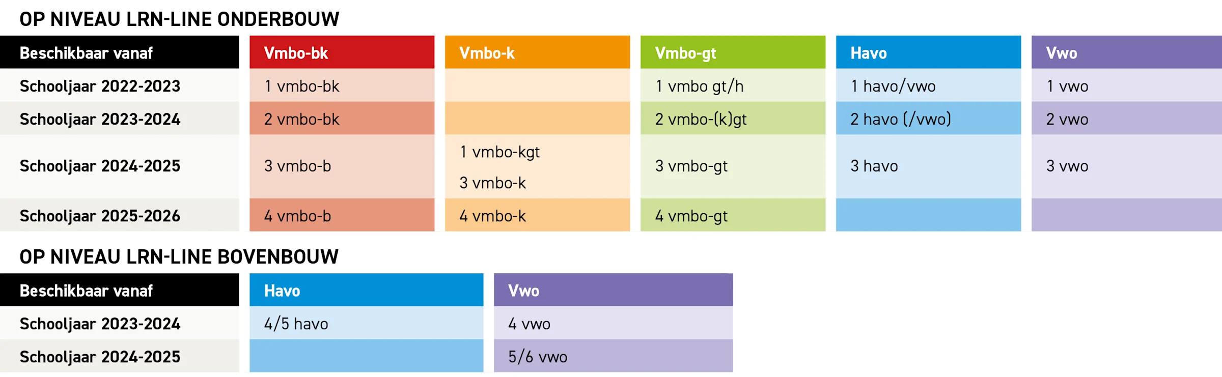 Op niveau LRN-line is er voor de onderbouw voor vmbo, havo en vwo en voor de bovenbouw voor havo en vwo. In onderstaand schema zie je welke leerjaren en niveaus beschikbaar zijn. De methode is gebaseerd op de nieuwste inzichten en ontwikkelingen in het onderwijs. Wij geloven dat leren leuk moet zijn en dat leerlingen het beste leren als ze zelf actief betrokken worden bij het leerproces.