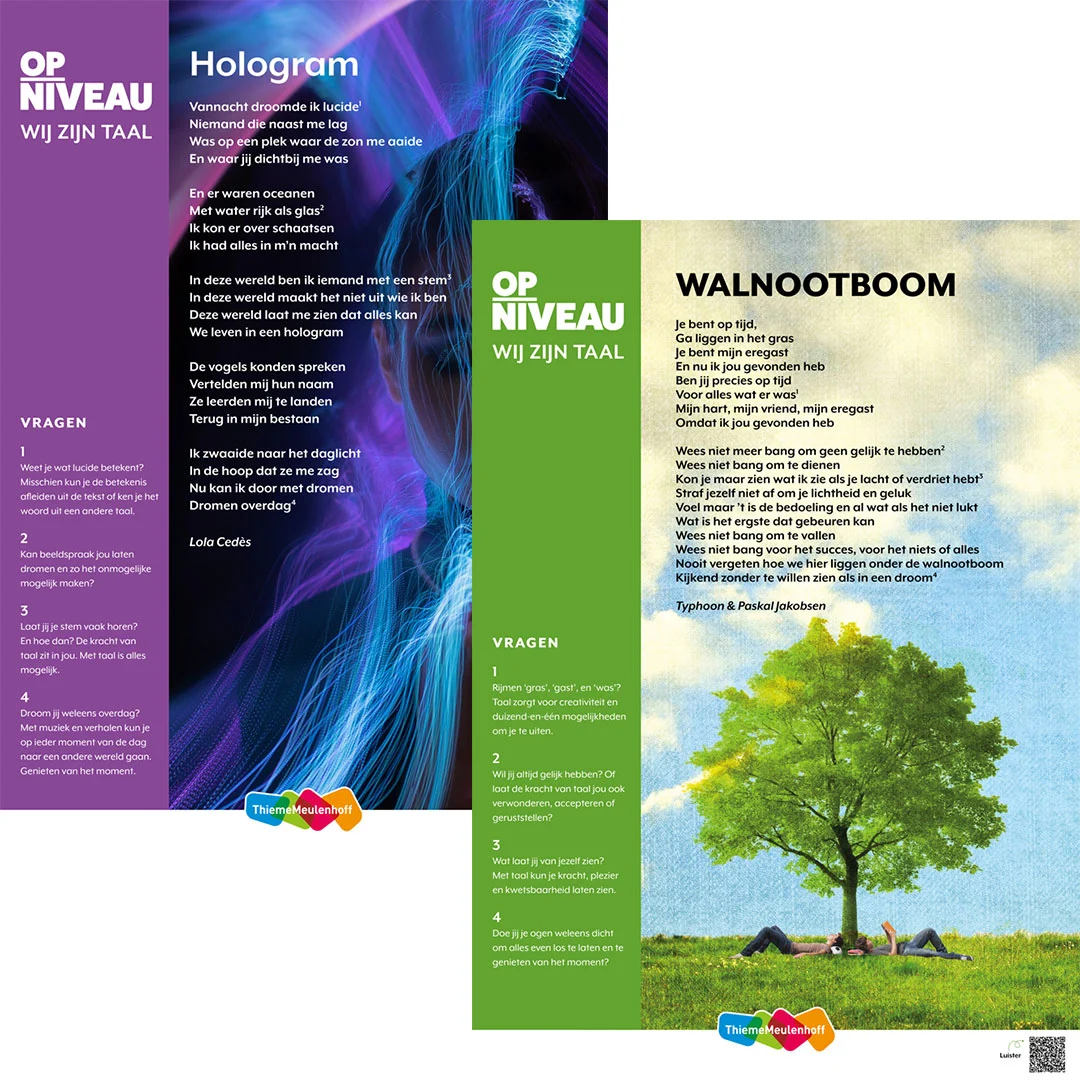 Breng de liefde voor taal naar je klaslokaal met deze set van twee literaire songtekstposters. Met de teksten Hologram van zangeres en aanstormend talent Lola Cedès en Walnootboom van Typhoon met Paskal Jakobsen van BLØF. Bespreek de songteksten met je leerlingen aan de hand van de vragen in de linkerbalk op de poster. De nummers beluisteren kan via de QR-code rechts onderaan.